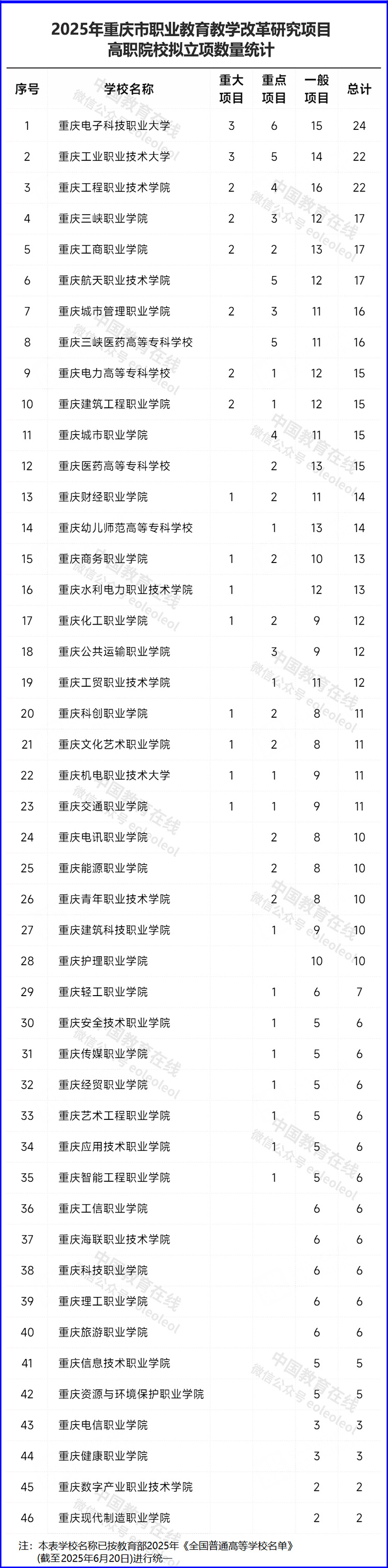 10月27日好多牛,重庆市教育委员会发布《2025年重庆市职业教育教学改革研究项目拟立项名单公示》。根据相关文件要求,经个人申报、学校推荐、专家评审推荐,2025年度拟立项职业教育教学改革研究项目652项,其中重大项目38项、重点项目93项、一般项目521项。