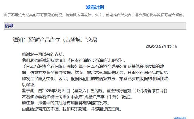 更让人皱眉的是,日本石油协会从3月21日那周开始,暂停公布成品油库存数据。官方解释没有展开太多,只说相关“产品库存”统计暂停发布。