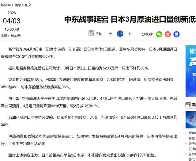 日本石油协会会长木藤俊一说得很直,动用公私储备只能先撑到4月底,就算马上从美国或者别的地方买油,新货最快也要6月才能到。这个时间差,才是真正让东京睡不着觉的东西。